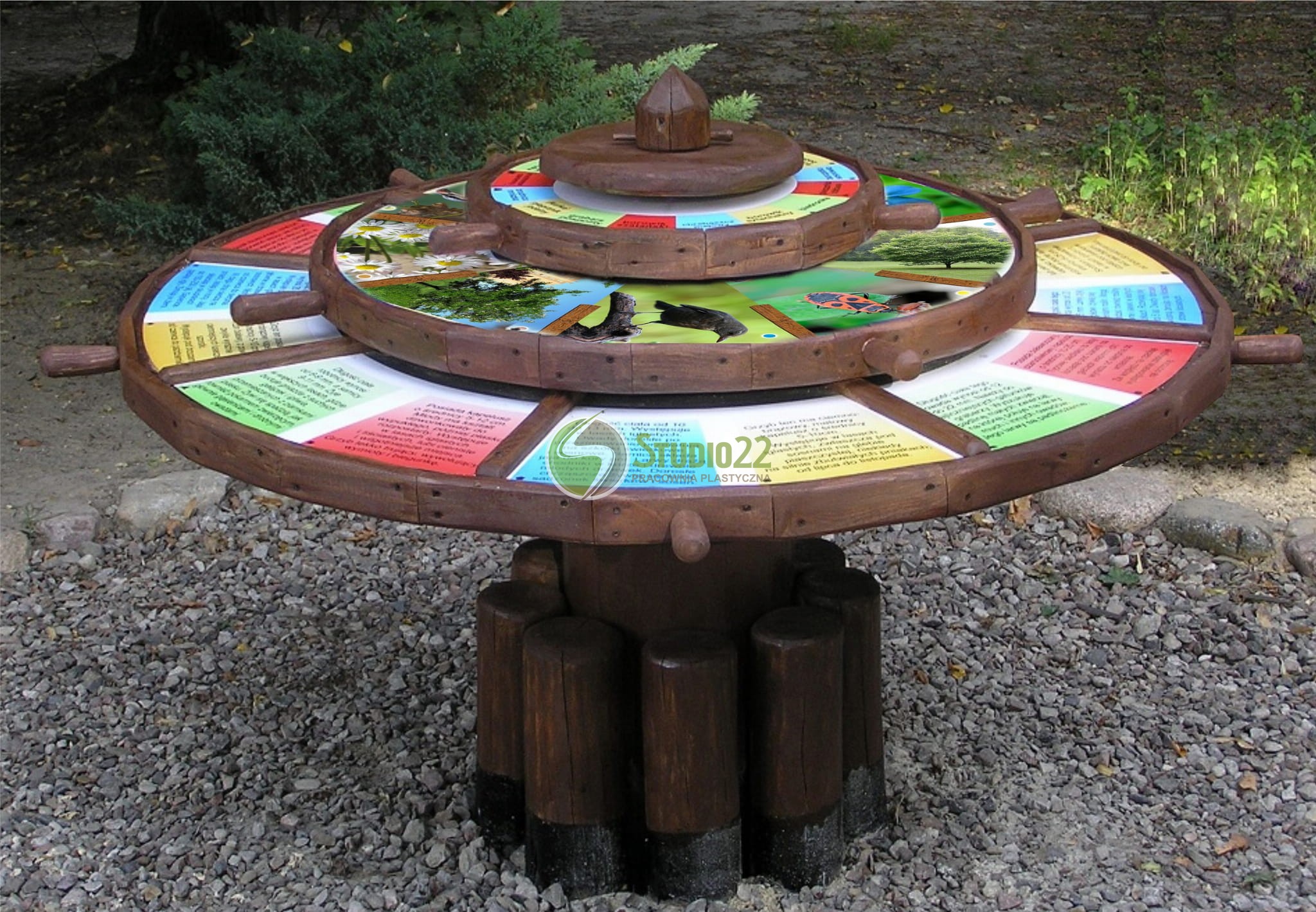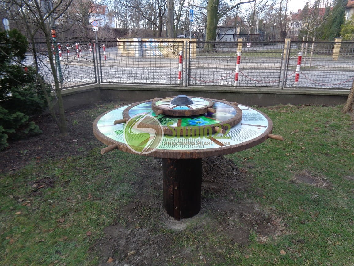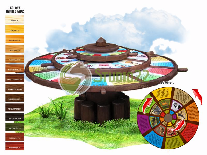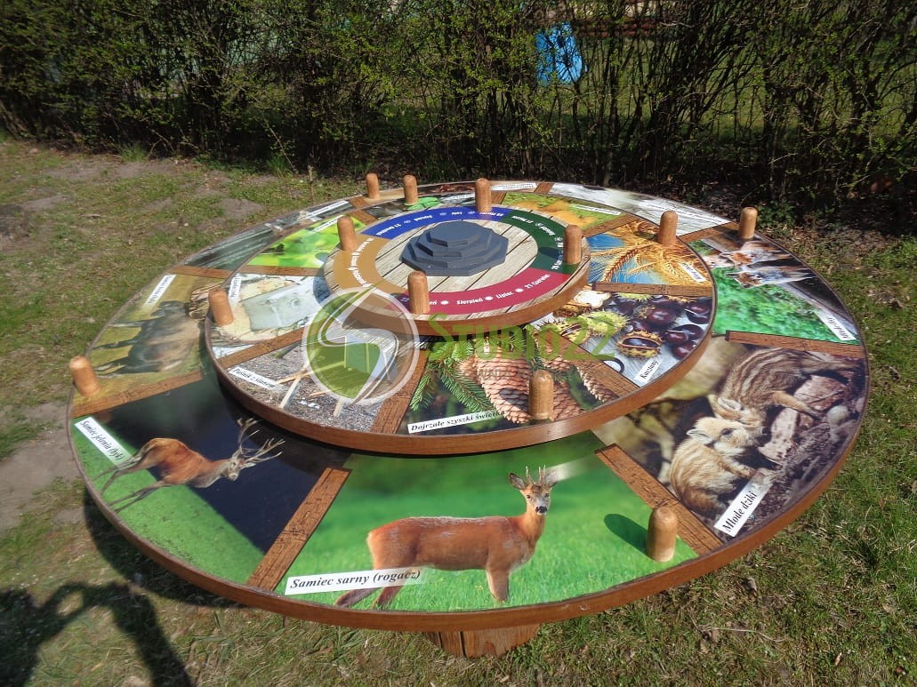 Koło wiedzy "Stoliczku obróć się" to przyrząd edukacyjny, w którym zabawa polega na wprawieniu w ruch kół znajdujących się w płaszczyźnie poziomej i dopasowaniu do siebie informacji.